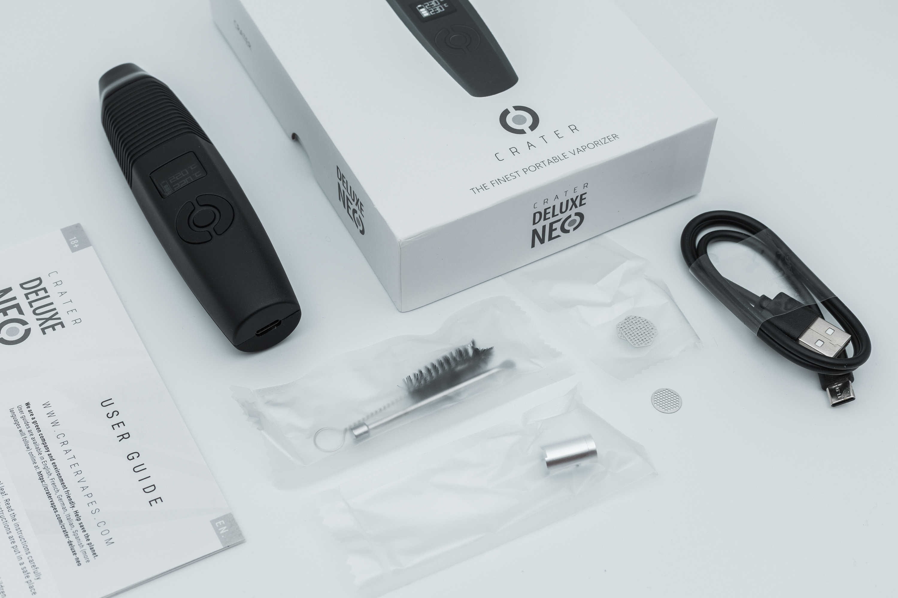 What’s in the box: CRATER Deluxe NEO vaporizer, USB-C cable, cleaning brush + packing tool, removable oil cup, 2× replacement mouthpiece screens, user guide, and 1-year warranty (see manual). Extended benefits are available via CRATER CLUB (paid monthly service with device registration).